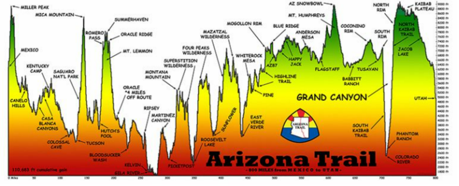 Ausgehend von der Grenze zwischen den USA und Mexiko schlängelt sich der Weg von einer Bergkette zur nächsten, überwindet dabei Tausende von Höhenmetern und durchquert Biome von der Wüste bis zum borealen Wald. Weiter geht es durch die Sonora-Wüste, überquert den Gila River, schlängelt sich durch die Superstition Mountains und die Mazatzal Wilderness zum Mogollon Rim und den majestätischen San Francisco Peaks. Der Pfad nach Norden führt Wanderer durch den Grand Canyon und offenbart dabei Jahrmillionen alte geologische Formationen. Auf dem Nordrand des Grand Canyon dominieren Nadelwälder das Kaibab-Plateau, das schließlich in rote, mit Salbeisträuchern bewachsene Felswände übergeht, wenn der Weg sich der Grenze zu Utah am Rande des Vermilion Cliffs National Monument nähert. Er bildet das Rückgrat Arizonas.